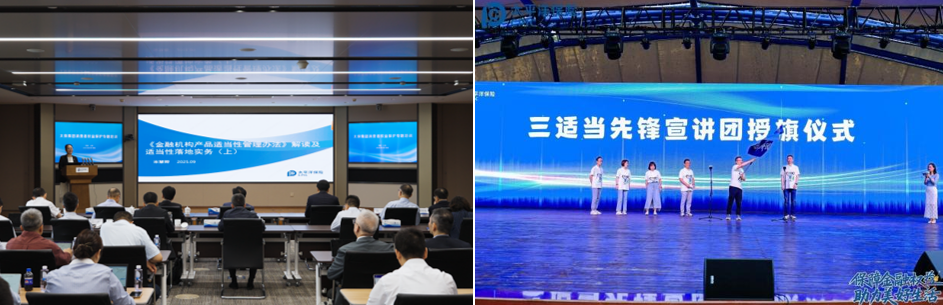 中国太保面向各级机构中高层管理人员组织开展了监管新规解读及实践经验分享专题培训,同时计划面向全集团开展线上全员培训,推动各经营单位压实适当性管理主体责任,夯实消保全流程工作基础。多地机构成立了“三适当先锋宣讲团”,通过深入基层、贴近群众的宣讲活动,引导消费者理性选择金融产品,实现金融服务从“被动响应”到“主动守护”的升级。