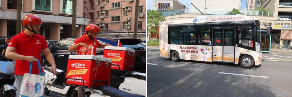 在深圳,中国太保产险、中国太保寿险联合多方机构打造移动金融教育阵地。中国太保创新宣传场景,依托药物配送网络将金融教育折页、风险提示手册等宣传物料精准送达市民手中;同时采用公交车身、地铁灯箱作为宣传载体,以醒目图文和简洁标语提升公众记忆点和关注点,将金融消保口号精准传递至通勤人群、社区居民及商圈消费者,实现金融教育“送上门”。